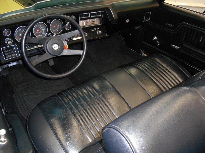 Interior: Correct code “704” Black bench seat interior, factory air conditioning, factory SS steering wheel, the radio is a factory AM/ 8 track radio, the factory air cond is all there and I’m sure it will need a charge, everything including factory tinted glass, convertible top and parade boot, carpet, door panels seat covers, headliner, interior everything looks very nice.